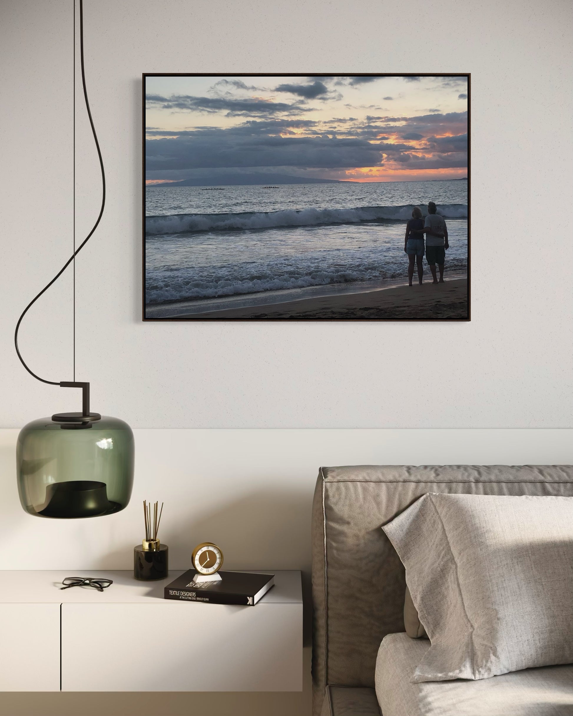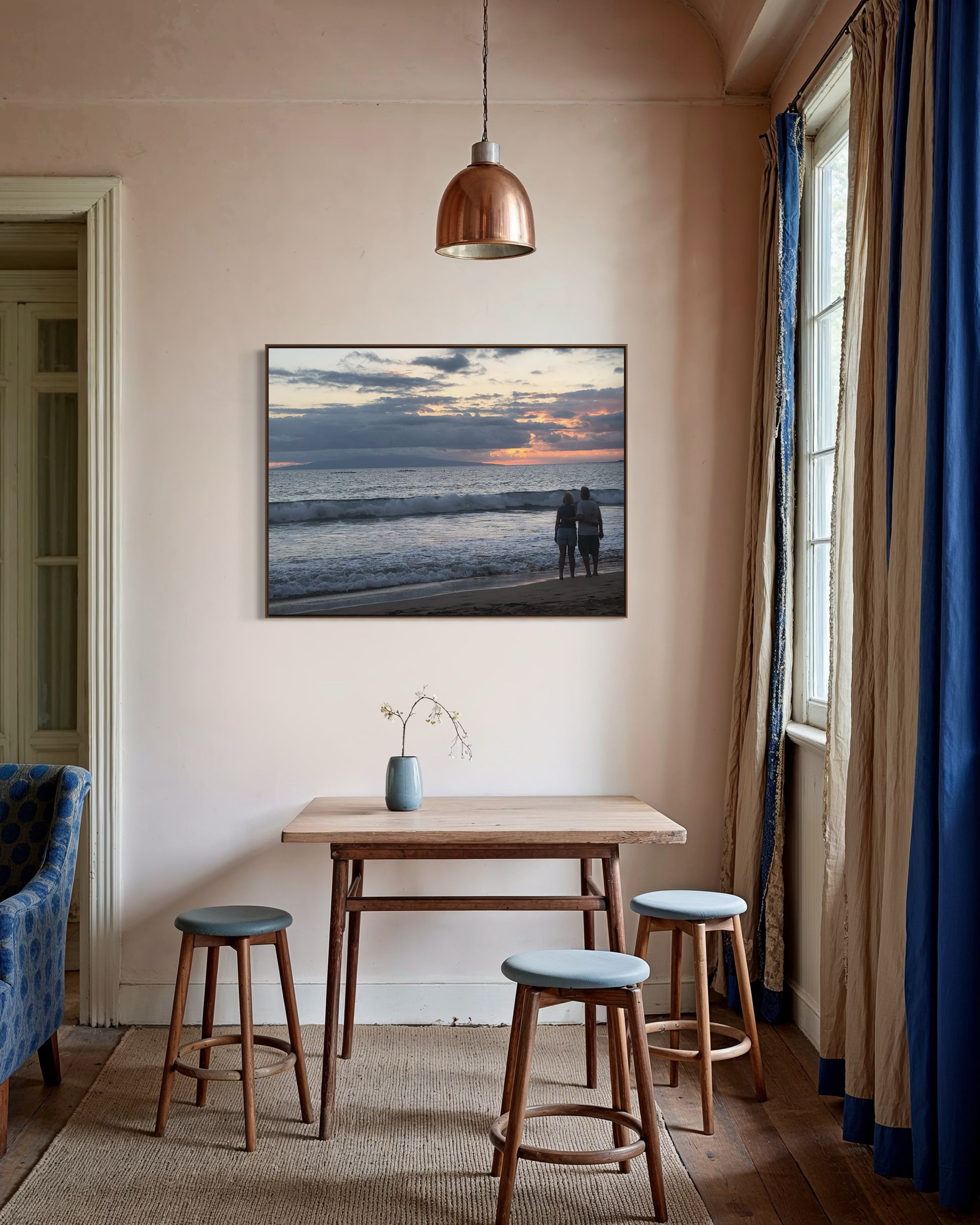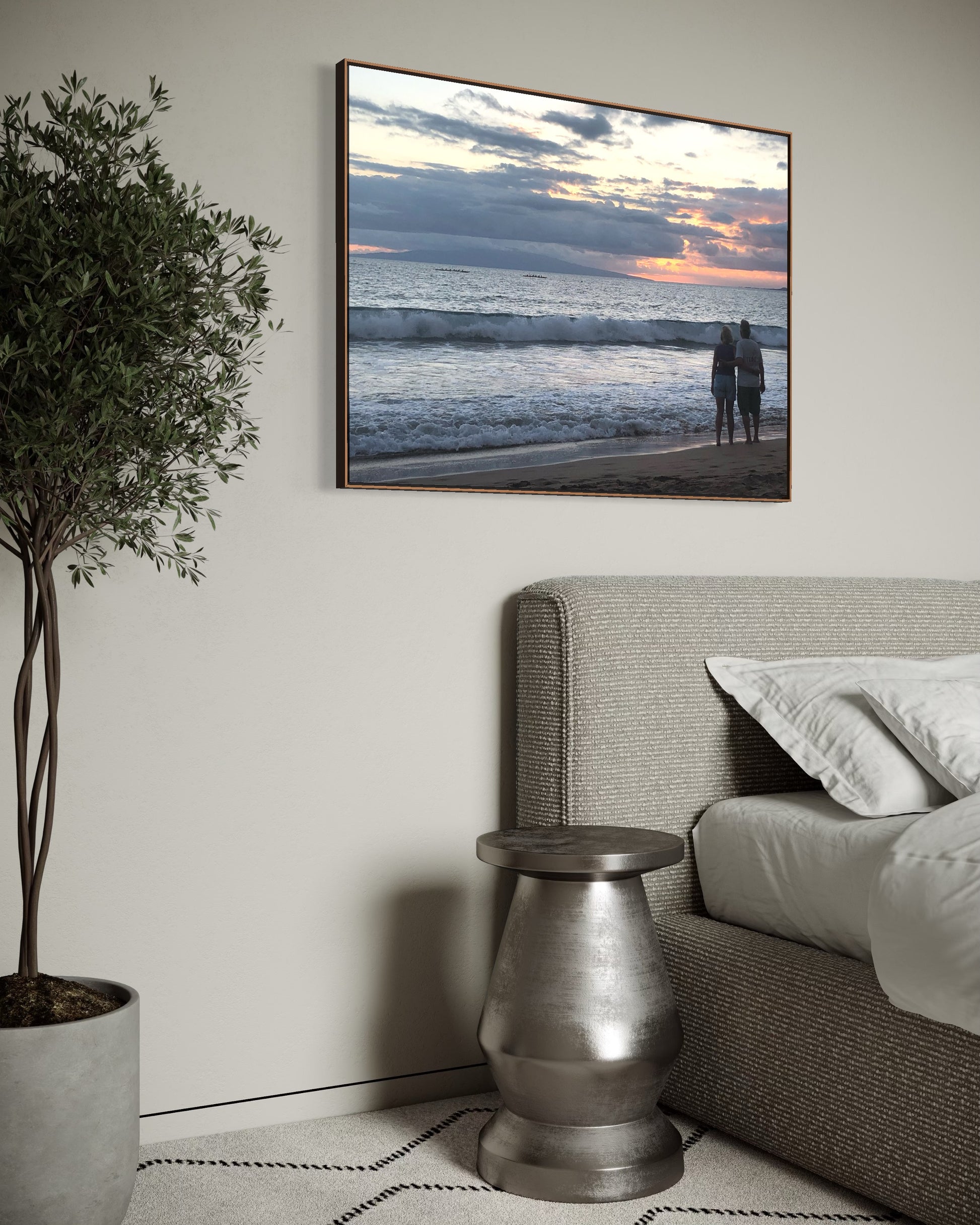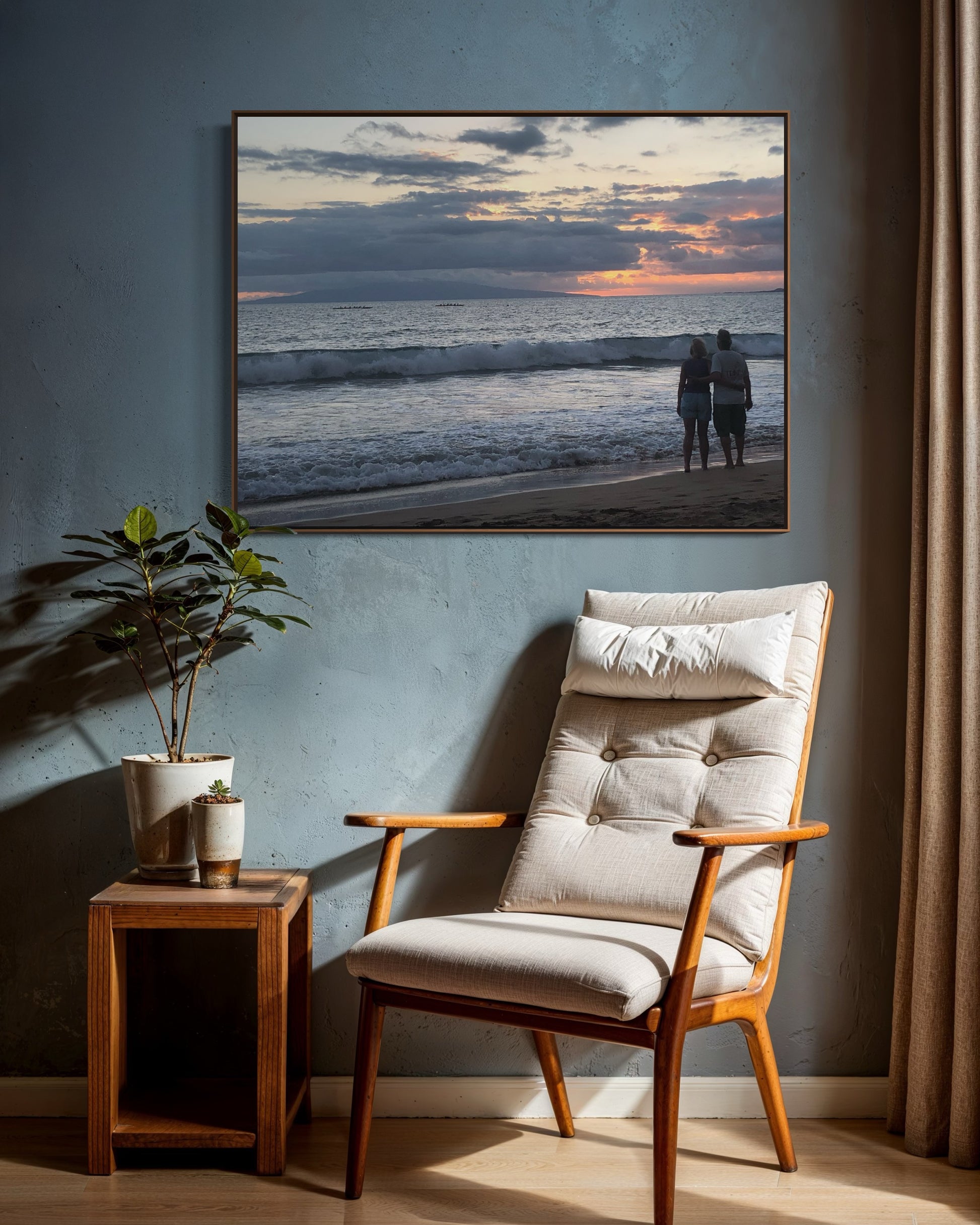 A couple stands hand in hand at sunset as outrigger canoes glide along the horizon. The waves echo the heartbeat of the island…constant, rhythmic, eternal. “Evening Paddlers” captures that sacred Maui moment we appreciate and give gratitude to the power of nature.